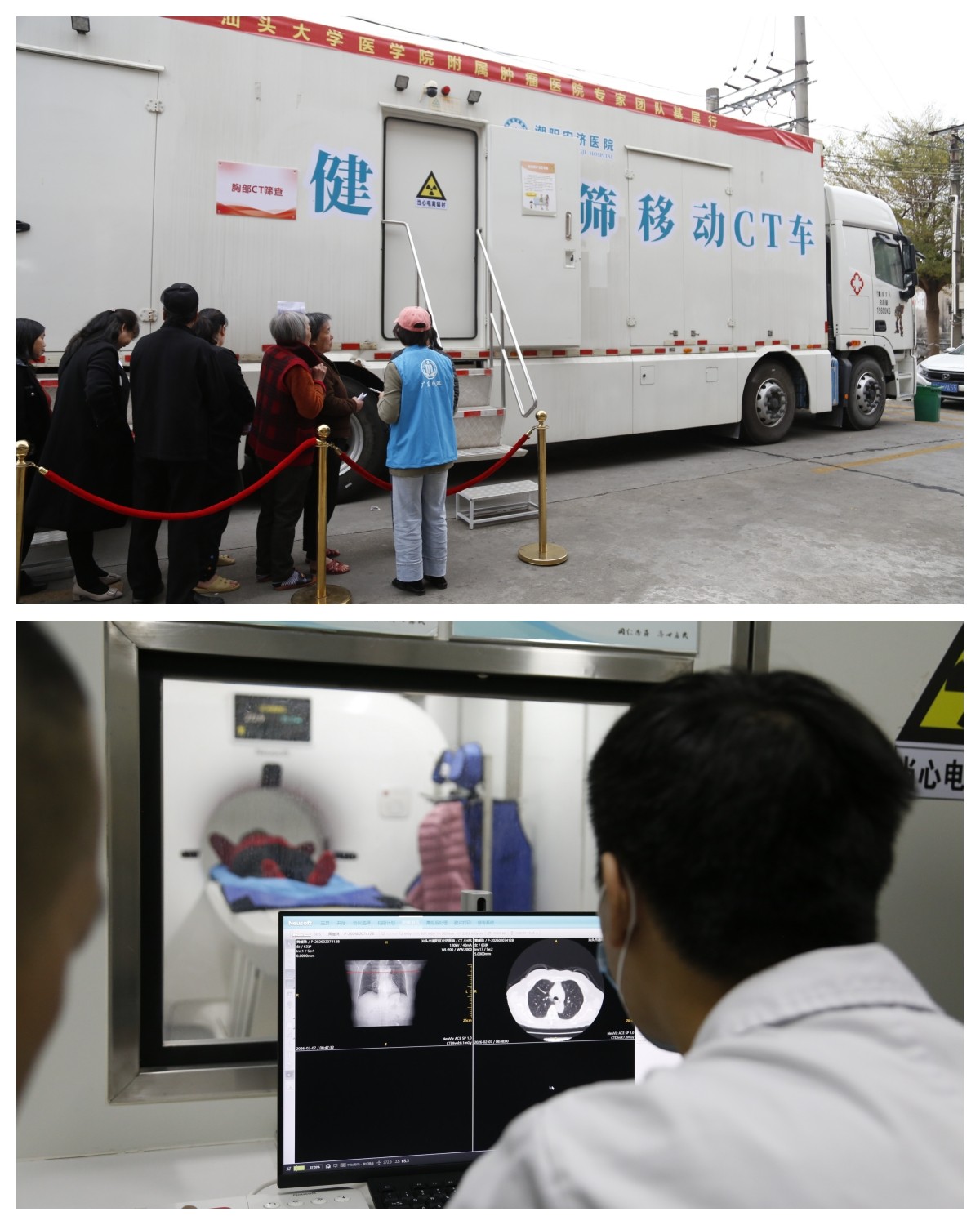 备受关注的“移动CT检查车”成为现场焦点。面对有限的免费名额,村民们有序排队。我院工作人员与肿瘤医院专家一同,认真为预约者进行风险评估问卷填写,筛选出高危人群,共完成肺部CT检查114例。现场的村民非常感慨:“这个大家伙开进村里,让我们不用跑远路就能做上大检查,太方便了!”
