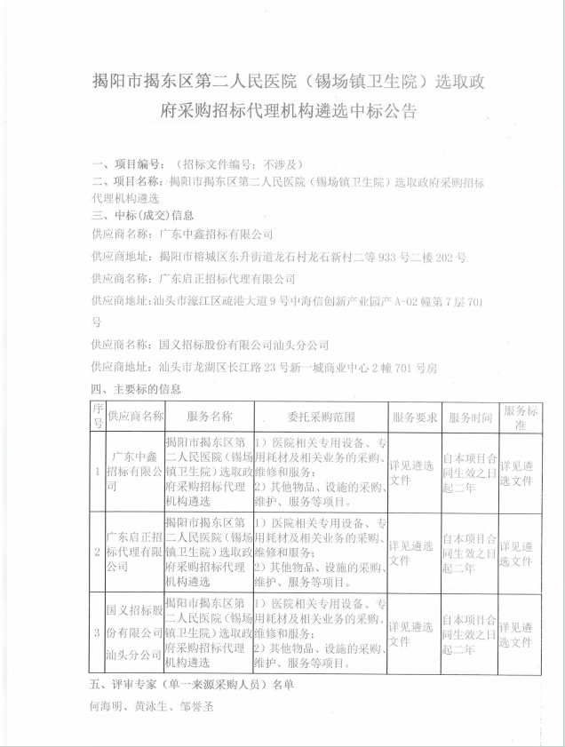 揭阳市揭东区第二人民医院(锡场镇卫生院)选取政府采购招标代理机构遴选中标公告