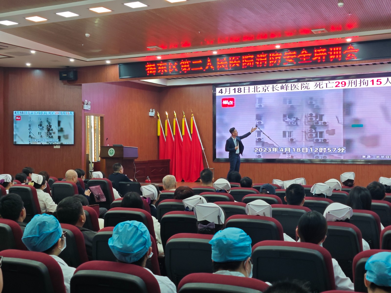 本次培训特邀菩安消防公司讲师陈杰周进行现场授课。陈讲师首先通过全国火灾数据统计,揭示了火灾防控的严峻性与重要性,并结合多地真实火灾监控及实拍视频,生动剖析了火灾常见成因、火势判断方法以及自救逃生要领,逐步引导医护人员树立起“安全第一、预防为主”的消防安全观念。
